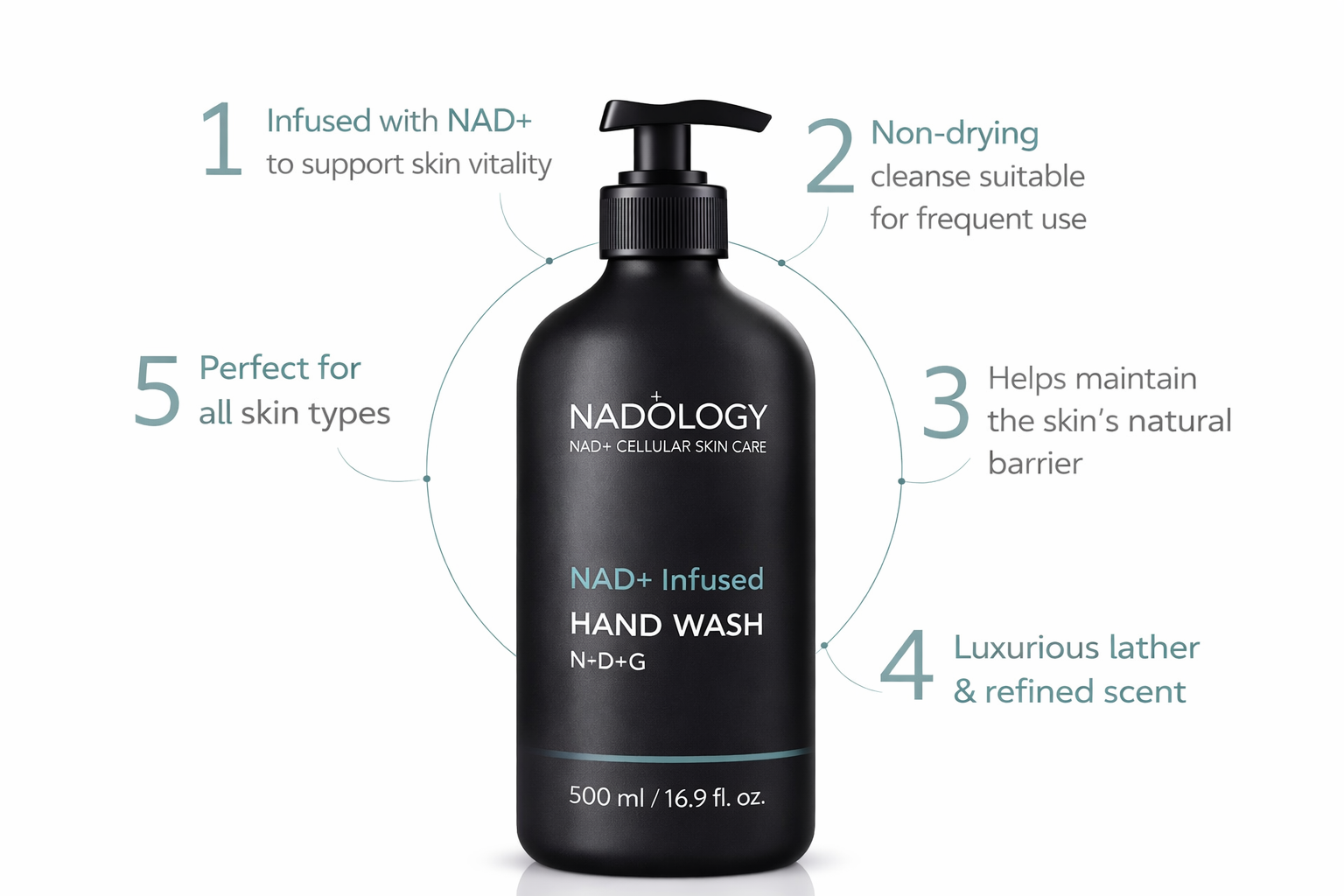 Elevate your everyday cleanse with our NAD+ Infused Face Wash, a modern formula designed to refresh, protect, and nourish your skin with every wash. Powered by NAD+ (Nicotinamide Adenine Dinucleotide)—a vital coenzyme known for supporting cellular vitality—this handwash goes beyond basic cleansing to help maintain healthy-looking, resilient skin.
